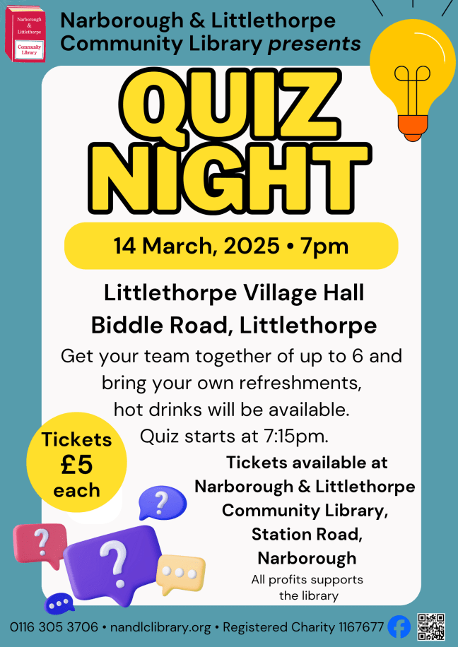 The quiz will take place at Littlethorpe Village Hall on Friday, 14th March, at 7pm, quiz to start at 7:15pm.